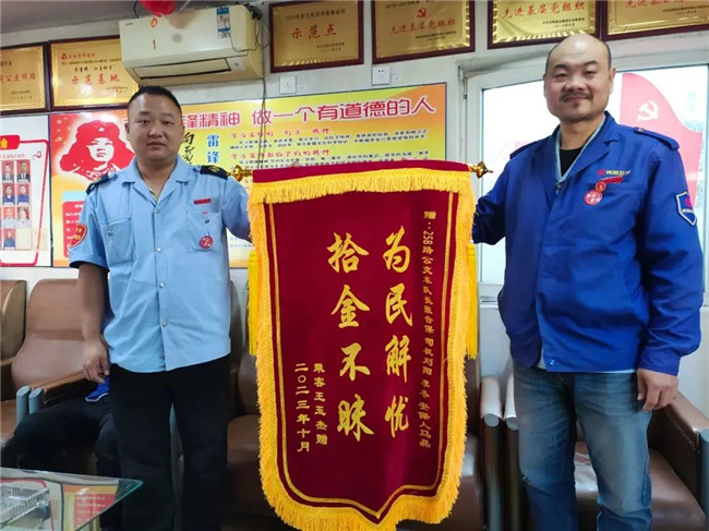 10月7日,一名乘客帶著寫有“拾金不昧 品德高尚”的錦旗來到211.222路車隊(duì),以此表達(dá)對(duì)駕駛員彭軍的感激之情。