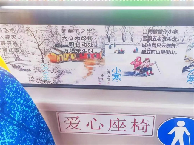 據(jù)方堃介紹,除了給乘客提供座墊套的服務外,她還通過上網(wǎng)搜集24節(jié)氣常識和詩句,在車廂內(nèi)的座位附近張貼了24節(jié)氣的相關詩句,方便乘客了解民風民俗,弘揚傳統(tǒng)文化,這些常識類的詩句很受一些帶孩子乘車的家長和孩子們的歡迎。