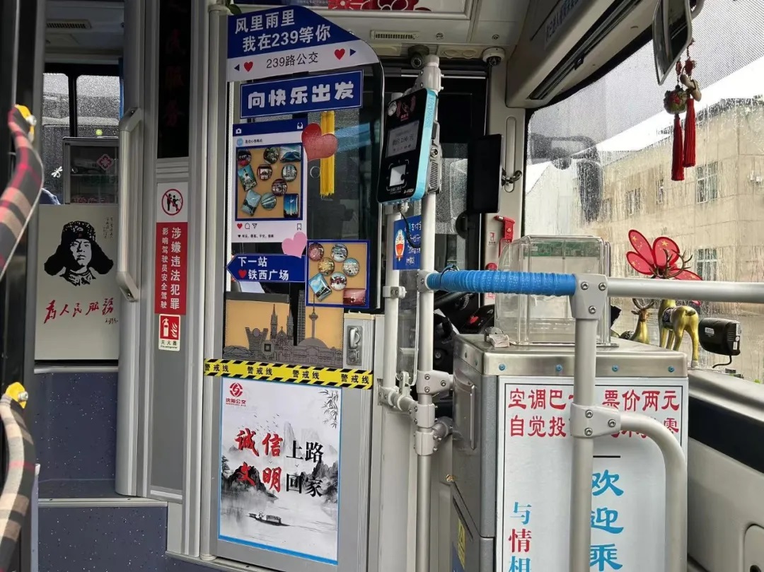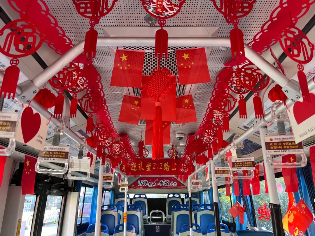 場(chǎng)面三:在沈陽(yáng)市勞動(dòng)模范、260路駕駛員繆立眾的車廂內(nèi),紅彤彤的國(guó)旗懸掛車廂兩側(cè),一句句祝福寄語(yǔ)祖國(guó),讓市民在乘車時(shí)也感受到濃厚的愛(ài)國(guó)情懷。