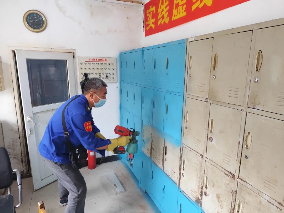 場(chǎng)面五:215路駕駛員陳守春利用自己的休息時(shí)間,帶來(lái)噴漆及工具,為大家的更衣柜穿了一件嶄新的“外衣”,美化車隊(duì)環(huán)境的同時(shí),又增添了濃郁的節(jié)日氣氛。