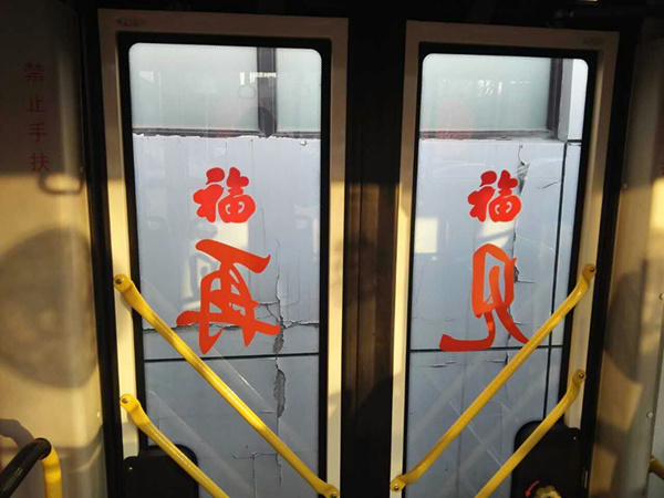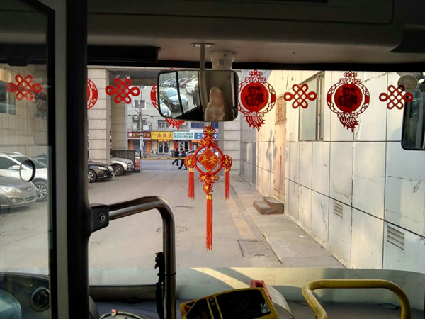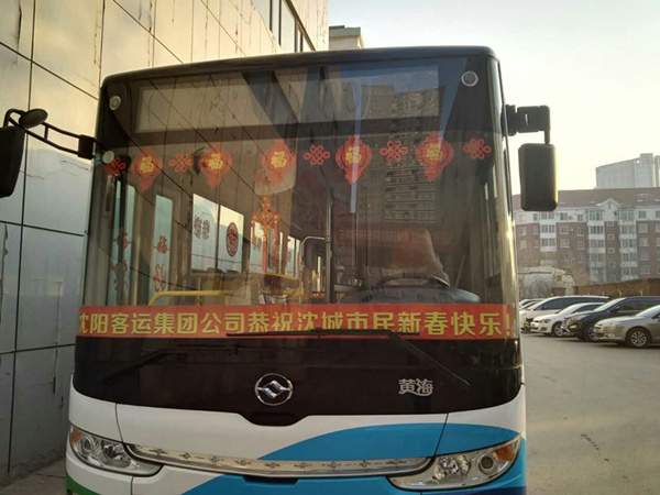 沈陽客運(yùn)集團(tuán)公司精心布置了車輛,粘貼了新年祝福標(biāo)語、福字、窗花,懸掛中國結(jié)和小燈籠,在車廂內(nèi)進(jìn)行裝飾,營造出移動的溫馨家庭感覺。