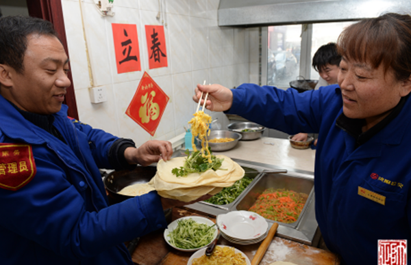 “哎呦,今天烙春餅啦!難怪老遠兒就聞見了香味兒??欤o我先來兩張!”2月3日大年初七,是節(jié)后的第一個工作日,恰逢立春。11時左右,211路駕駛員張智剛跑完一圈兒回到大北門終點站,就被食堂的飯香吸引過去。