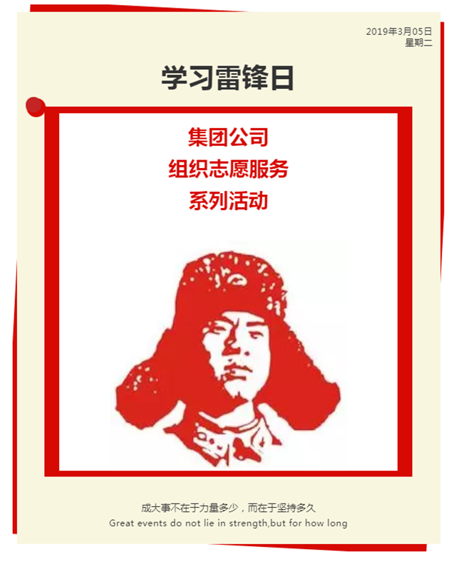 2019年3月5日是第56個學雷鋒紀念日,為進一步弘揚“雷鋒精神”,踐行社會主義核心價值觀,不斷激勵和引導集團廣大職工積極向上、樂于助人的服務理念和奉獻精神,2019年3月5日,集團公司團委組織廣大團員青年開展了學習雷鋒精神志愿服務主題活動。